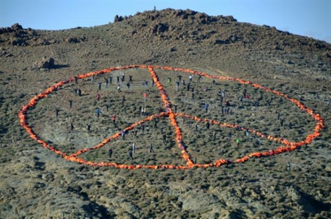 | Photo montrant l'immense signe de la paix formé avec les gilets de sauvetage de milliers de migrants, sur une colline de Lesbos, le 1er janvier. |