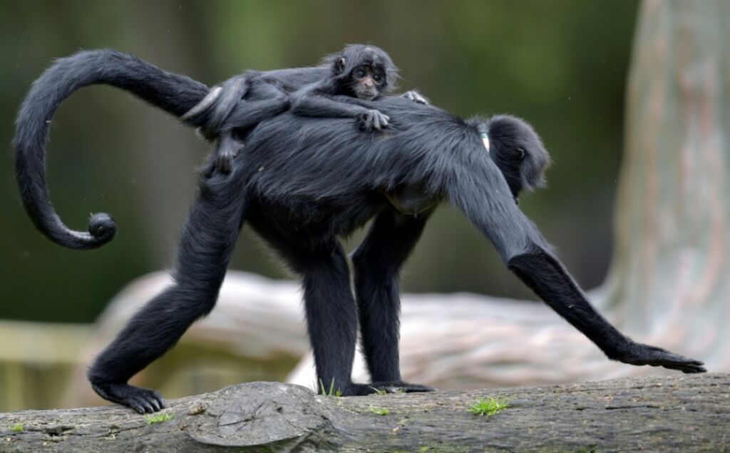 | Un singe-araignée porte son bébé à Briceno, près de Bogota (Colombie), le 30 juillet 2020. |
