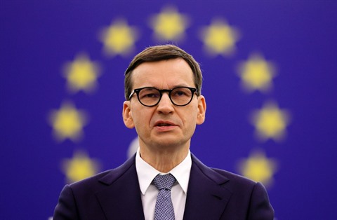 | Le Premier ministre polonais Mateusz Morawiecki, le 19 octobre, devant le Parlement européen à Strasbourg. |