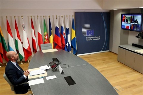 | Le président du Conseil européen en visioconférence depuis Bruxelles le 22 juin pour le sommet UE - Chine. |