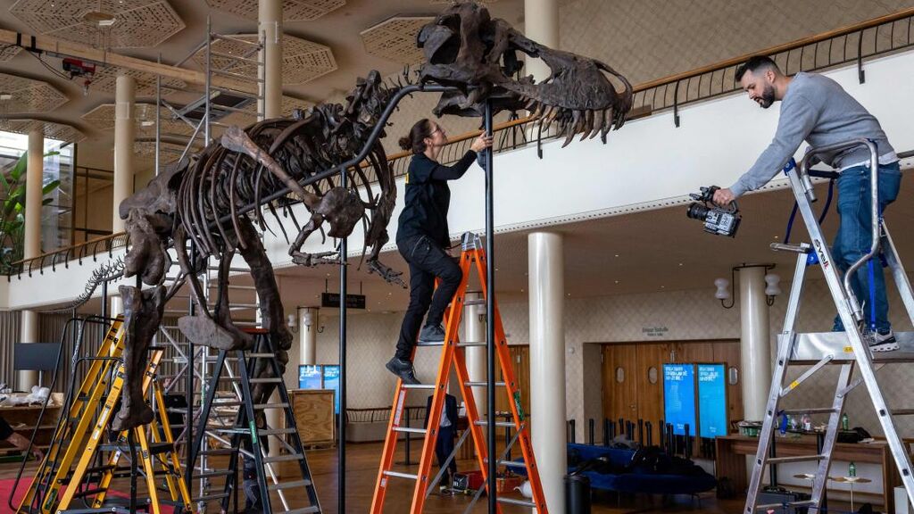 | Le chef de projet Nils Knoetschke participe à l'installation d'un squelette de T-Rex qui sera vendu aux enchères, à Zurich en Suisse. |