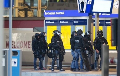 | Des membres de l'unité d'intervention de la police néerlandaise sur le quai près d'un train Thalys en gare de Rotterdam, le 18 septembre 2015. |