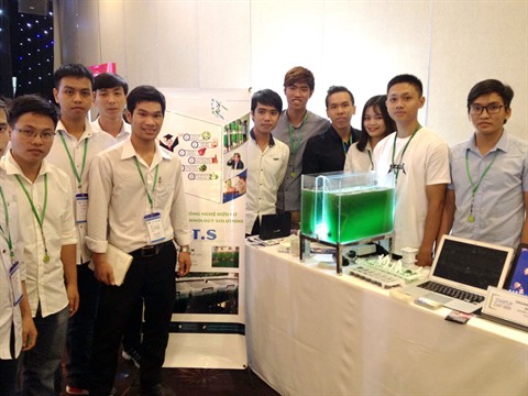 | Des étudiants de l’École polytechnique de Hô Chi Minh-Ville et leur système de culture de spiruline à domicile. |