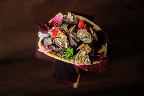 Cette version luxueuse d'un mets mexicain populaire et bon marché est composée de langouste, de bœuf de Kobé, de caviar beluga, de truffe noire et blanche, servie sur une tortilla de maïs contenant des feuilles d'or 24 carats.
