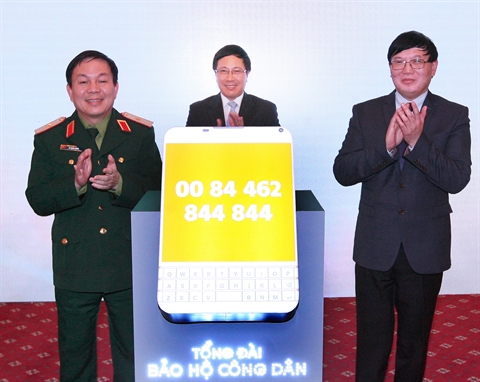 | Le vice-Premier ministre et ministre des Affaires étrangères Pham Binh Minh (centre), lors de la cérémonie de lancement d'un téléphone rouge pour la protection des Vietnamiens à l'étranger, le 2 février à Hanoi. |