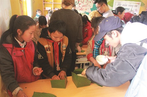 | C’est la première fois que ces enfants faisaient des "bánh chung". Photo : Nhât Minh/CVN |
