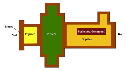 La dernière pièce, quant à elle, mesure 4,25 m de long, 2,06 m de large et 2,4 m de haut. C’est là que repose le cercueil ou plutôt reposait, car les archéologues n’ont trouvé ni cercueil ni même ossements. Un socle rectangulaire de 2,52 m de long et 0,21 m de haut indique son emplacement. Il n’est pas exactement au centre de la pièce, mais à 30 cm du mur ouest, à 1 m du mur est. Cette pièce est aussi flanquée d’un réduit à l’ouest, où étaient probablement déposés les objets censés accompagner le défunt dans son dernier voyage. Quelques céramiques brisées y ont d’ailleurs été trouvées.