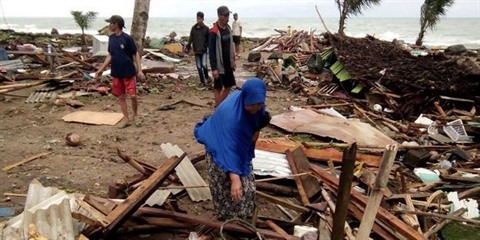 | Des Indonésiens fouillent les débris de leurs habitations sur la plage de Carita, sur l'île de Java, après que la région a été frappée par un tsunami le 22 décembre. |