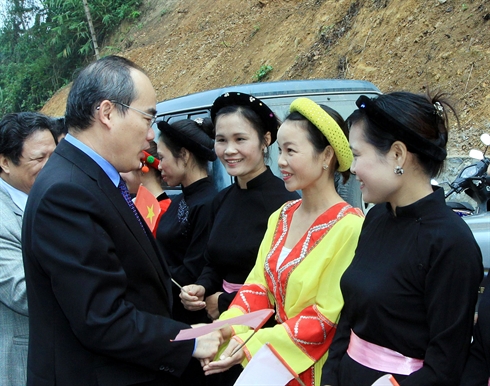 | Le président du Front de la Patrie du Vietnam (FPV), Nguyên Thiên Nhân, rencontre les habitants de la commune de Tân Trào dans la province montagneuse de Tuyên Quang (Nord), le 16 novembre. |