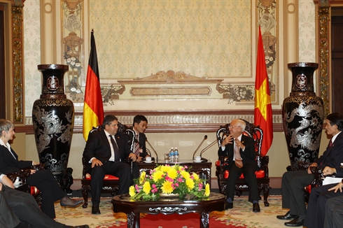 | Le président du Comité populaire municipal, Lê Hoàng Quân (droite) et le vice-chancelier et ministre allemand de l’Économie et de l’Énergie, Sigmar Gabriel, le 20 novembre à Hô Chi Minh-Ville. |