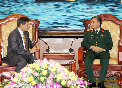 | Le vice-ministre de la Défense, le général Truong Quang Khánh (droite), et l'ambassadeur d'Ukraine au Vietnam, Oleksly Shovkoplias. |