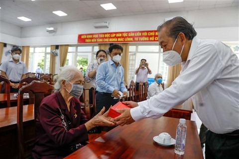 Le vice-Premier ministre permanent Truong Hoà Binh, accompagné des responsables du ministère du Travail, des Invalides de guerre et des Affaires sociales, du Comité populaire de Hô Chi Minh-Ville, est allée converser avec des mères héroïnes, bénéficiaires de politiques sociales et contributeurs de la révolution dans le 5e arrondissement et l’arrondissement de Tân Binh, à l’occasion du 74e anniversaire de la Journée des invalides de guerre et des martyrs (27 juillet 1947-2021).