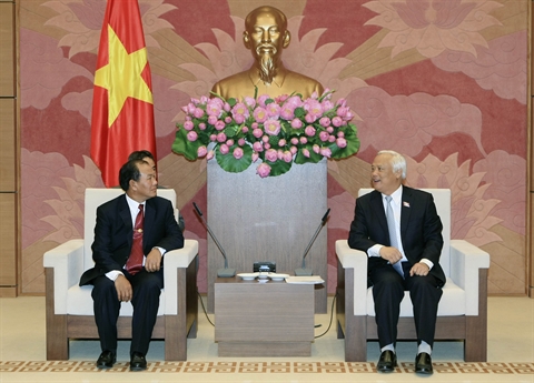 | Le vice-président de l'AN, Uông Chu Luu (droite), et le ministre lao de la Justice, Saysi Santivong, le 2 juin à Hanoi. |