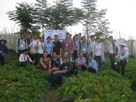 | Nguyên Quôc Vong (1er plan, centre) et ses confrères vietnamiens sur un champs de melon piriforme appliquant la technique VietGAP à Soc Son, en banlieue de Hanoi. |