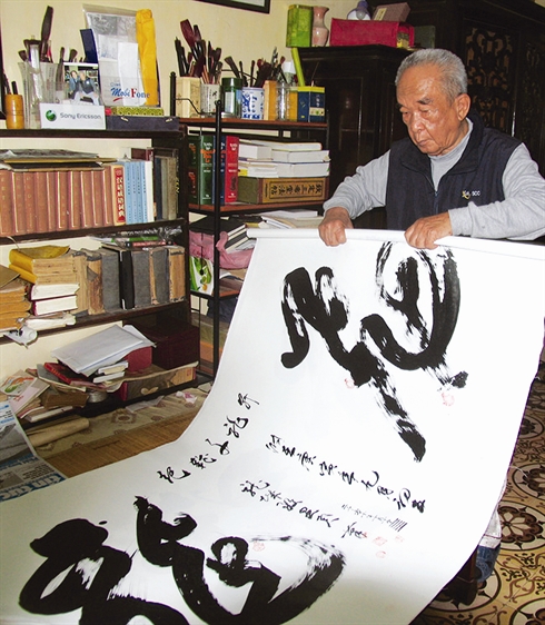 | Le calligraphe Nguyên Van Bach présente certaines de ses œuvres. |