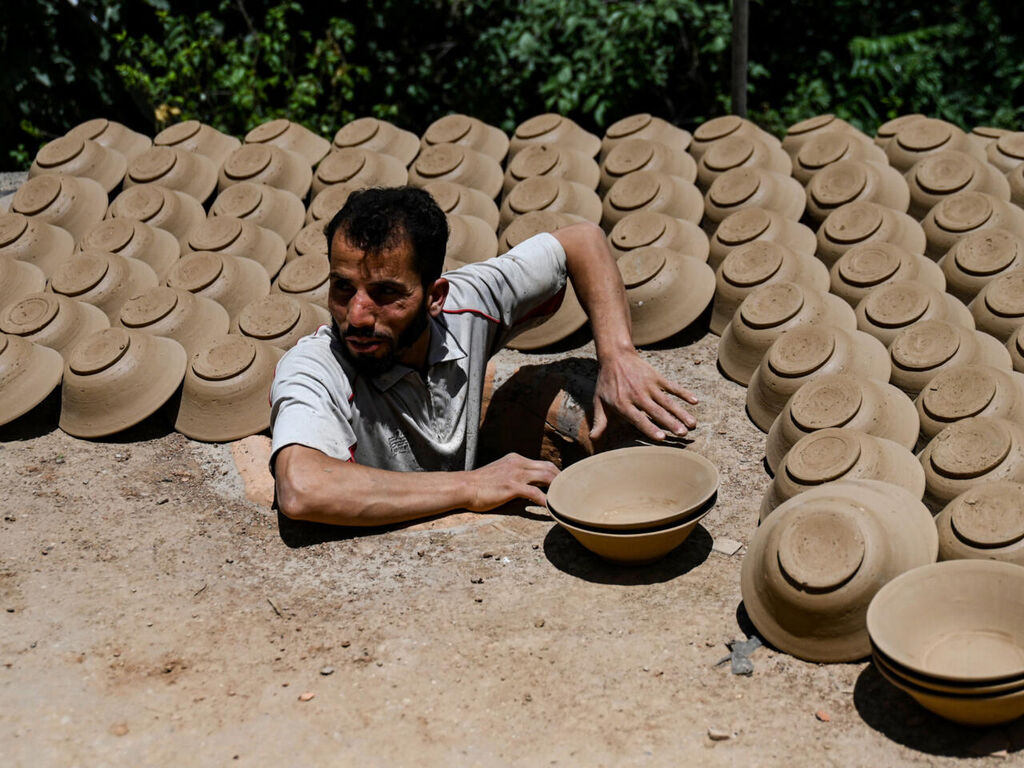 | Un potier récupère des bols en argile séchés au soleil pour les faire cuire dans son four, dans le district d’Istalif, près de Kaboul, en Afghanistan. |