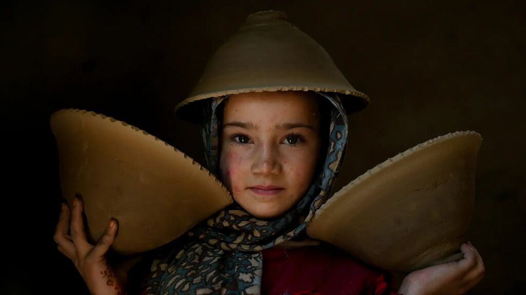 | Une fillette porte des bols en argile dans l’atelier d’une poterie traditionnelle du district d’Istalif, en Afghanistan. |