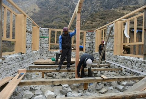| Des habitants de Langtang au Népal reconstruisent leur maison, le 7 avril 2016. |
