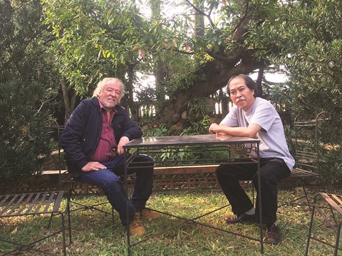 | Le poète Nguyên Quang Thiêu (droite) accueille son confrère colombien Fernando Randon. |