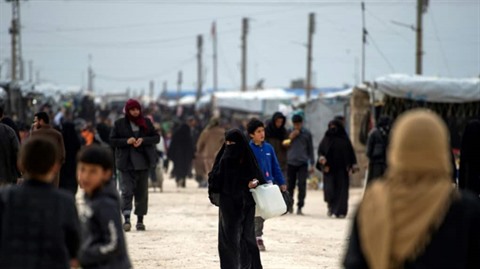 | Des Syriens marchent dans le camp de déplacés d'Al-Hol, dans la province de Hassaké, dans le Nord de la Syrie, le 6 février |