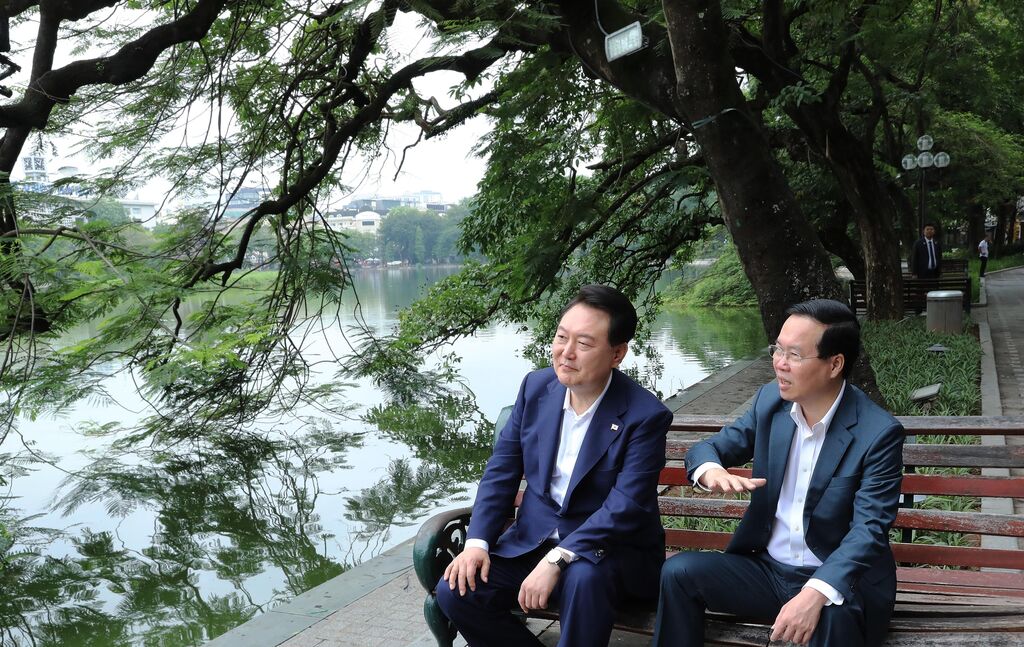 | Le président vietnamien Vo Van Thuong (droite) présente le lac Hoàn Kiêm (lac de l’Épée restituée) à son homologue sud-coréen Yoon Suk Yeol, le 24 juin 2023 à Hanoï. |