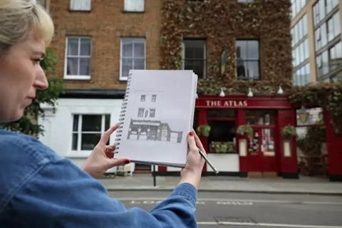 | L'artiste britannique Lydia Wood montre le croquis du pub The Atlas qu'elle vient de réaliser, le 26 mai à Londres. |