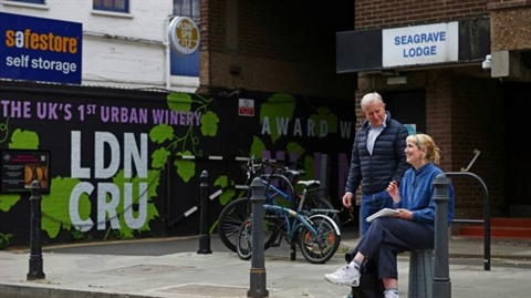 | L'artiste britannique Lydia Wood discute avec un passant devant le pub The Atlas qu'elle est en train de dessiner, le 26 mai à Londres. |