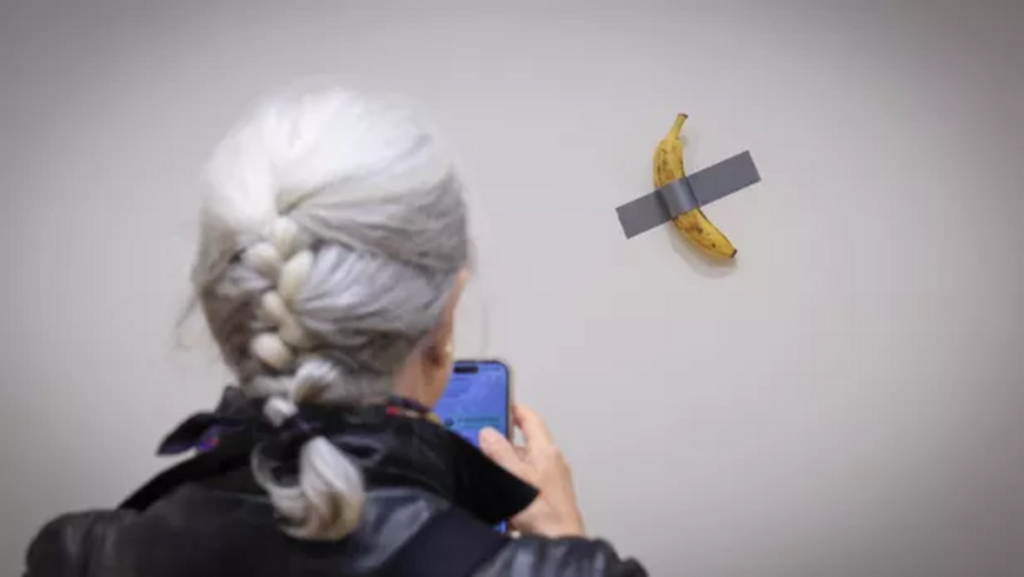 L'oeuvre de l'artiste iconoclaste et provocateur Maurizio Cattelan, qui existe en trois exemplaires, est censée interroger la notion d'art et sa valeur. Elle a beaucoup fait parler d'elle depuis sa première exposition en 2019 à Miami, où un autre artiste l'avait mangée pour dénoncer son prix, à l'époque 120.000 USD. Un autre exemplaire a été donné au musée Guggenheim de New York.