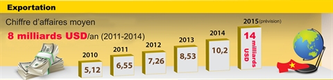 Selon les prévisions, leur exportation augmentera plus fortement cette année grâce à l’entrée en vigueur de plusieurs accords de libre-échange auquel le Vietnam est partie. Dans la période 2011-2015, le chiffre d’affaires annuel à l’exportation de ce secteur a atteint 8 milliards de dollars, et en 2015, il devrait s’établir à 14 milliards de dollars. Le secteur compte actuellement 800 entreprises en activité, avec un ratio entreprises domestiques-étrangères de 7 pour 2, lesquelles emploient un million de personnes dont 85% de femmes. Le taux de matières premières fabriquées au Vietnam est de 40%, le reste étant importé, en particulier les machines, les équipements et les matières premières de cuir.