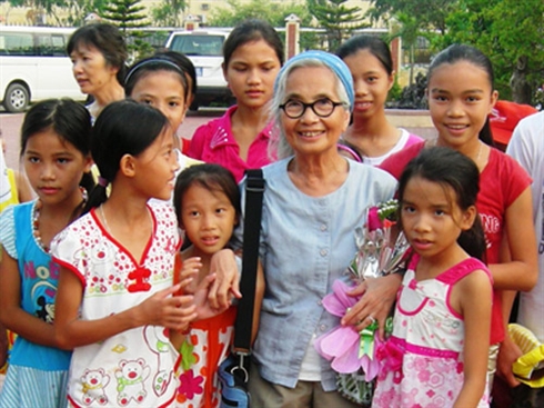 | Madame le professeur Lê Kim Ngoc entourée d’enfants orphelins. |
