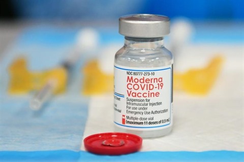 | Un flacon de vaccin Moderna, dans un centre de vaccination, en décembre 2021 aux États-Unis. |
