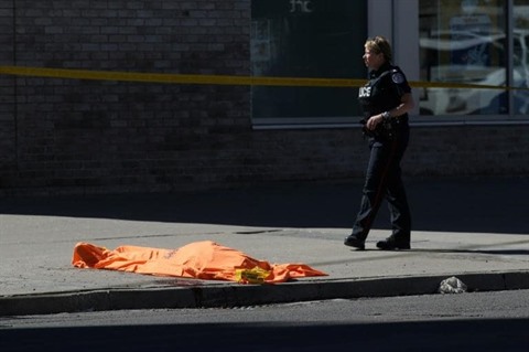 | Un corps gît sous un drap à Toronto le 23 avril après qu'une camionnette a fauché une dizaine de piétons |