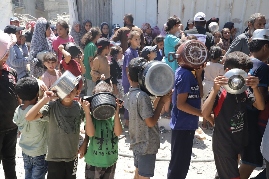 | Des enfants font la queue pour recevoir une aide alimentaire dans un camp de réfugiés du nord de la bande de Gaza, le 21 août 2024. |