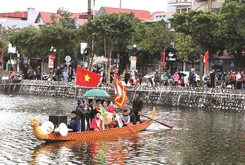 | Une représentation du "chèo" à bord d’une barque en forme de dragon sur la rivière Bach Dang, dans la ville de Hai Duong (Nord). |