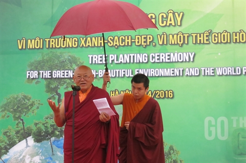 | Sa Sainteté Drikung Chetsang Rinpoché prononce un discours lors de la cérémonie de plantation d’arbres, le 2 avril au parc Hoà Binh, à Hanoi. |