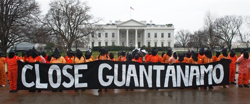 | Des manifestants vêtus des célèbres combinaisons oranges et encagoulés de sacs noirs, avec le slogan : "Fermeture de Guantanamo", le 11 janvier devant la Maison Blanche à Washington. |