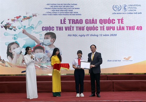La 49e édition du concours de composition épistolaire de l’UPU a pour thème "Écris un message à un adulte sur le monde dans lequel nous vivons". Dans sa lettre, Phan Hoàng Phuong Nhi a envoyé un message sur la protection de l’environnement non seulement avec des paroles, des pensées, mais avec des actions. La lettre a contribué à faire la promotion de l’image des gens et de la culture de son pays auprès des amis internationaux.