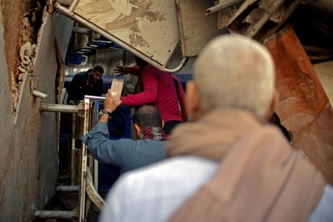 | Des hommes dans un wagon disloqué après une collision entre deux trains dans le sud de l'Égypte, près de Sohag, le 26 mars |