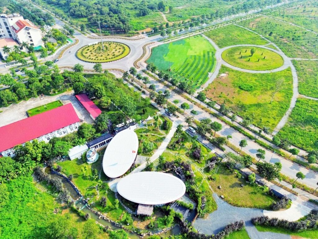 | Vue aérienne du Centre de bibliothèque et de connaissances numériques de l'Université nationale de Hanoï. |