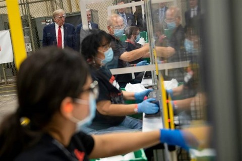 | Le président américain Donald Trump visite une usine de masques à Phoenix le 5 mai. |