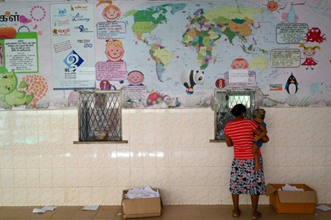 | Une femme, son enfant dans les bras, attend des médicaments à la pharmacie de l'hôpital public pour enfants Lady Ridgeway, le 21 avril 2022 à Colombo, au Sri Lanka. |