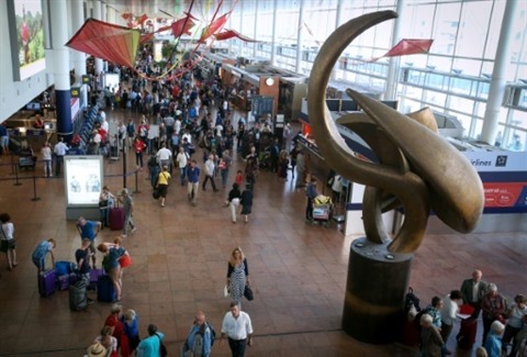 | Des passagers en attente à l'aéroport Zaventem à Bruxelles, le 3 août 2015. |