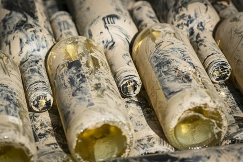 | Bouteilles recouvertes de boue, dans le cadre de l'initiative solidaire "Flutwein" ("Vin de crue"), à Bad Neuenahr-Ahrweiler (Ouest de l'Allemagne), le 30 juillet. |