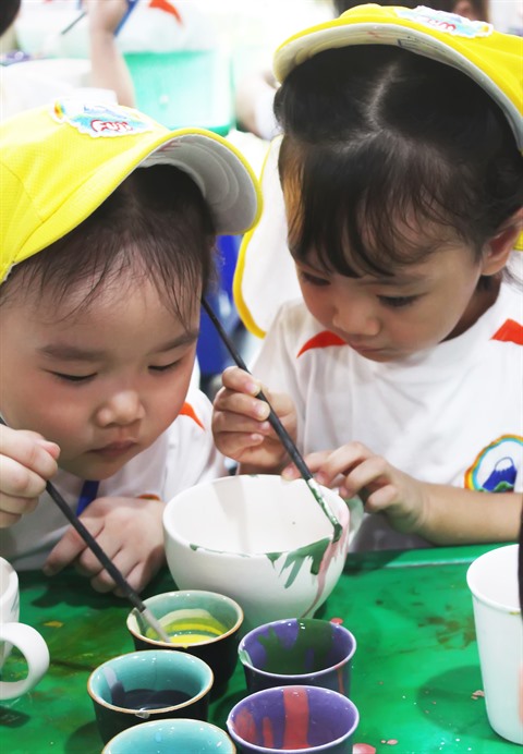 "Aujourd’hui, nous amenons les élèves ici pour les faire découvrir l’art de la poterie", explique Thuy, 27 ans, institutrice de l’École maternelle Kid Star. "Après avoir visité l’ancien four, les enfants sont répartis en deux groupes selon leur âge. Les petits de 3 à 4 ans colorient de petits objets comme des figurines ou des gobelets alors que ceux de 5 à 6 ans apprennent à confectionner des assiettes, des vases".