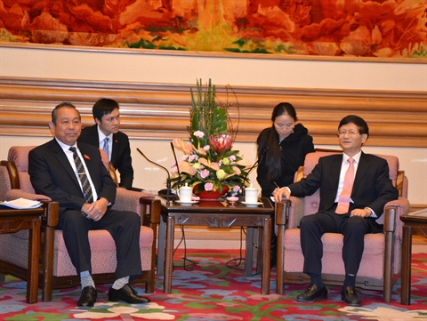 | Le président de la Cour populaire suprême du Vietnam, Truong Hoa Binh (gauche), et Meng Jianzhu, chef de la Commission des affaires politiques et juridiques du Comité central du Parti communiste chinois. |