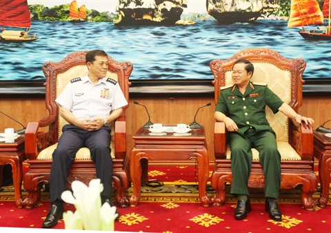 | Le général de corps d'armée Dô Ba Ty (droite), chef d'état-major général de l'Armée populaire du Vietnam, et le chef d'état-major de la force aérienne d'autodéfense japonaise Harukazu Saito |