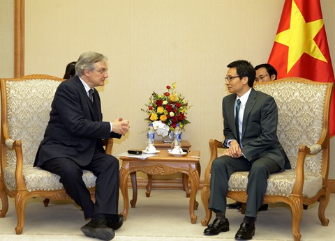 | Le vice-Premier ministre vietnamien Vu Duc Dam (droite) et le président de l'Association de la presse étrangère en Suisse et au Liechtenstein, Jean Musy, le 28 novembre à Hanoï. |