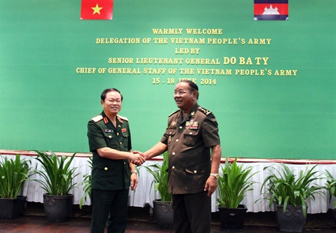 | Le chef d'état-major général de l'Armée populaire du Vietnam, Dô Ba Ty (gauche), et le commandant en chef de l'Armée royale du Cambodge, Pon Saruon, le 16 juin à Sihanoukville. Photo : Xuân Khu/VNA/CVN |