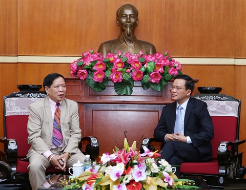 | Le vice-président du Comité central du FPV, Nguyên Van Pha, (droite) et l'avocat Khamsay Soulinthone, le 24 mai à Hanoi. |