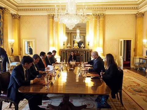 | Rencontre entre la délégation vietnamienne du CC du PCV (gauche) et le prince Andrew au palais de Buckingham, à Londres. |